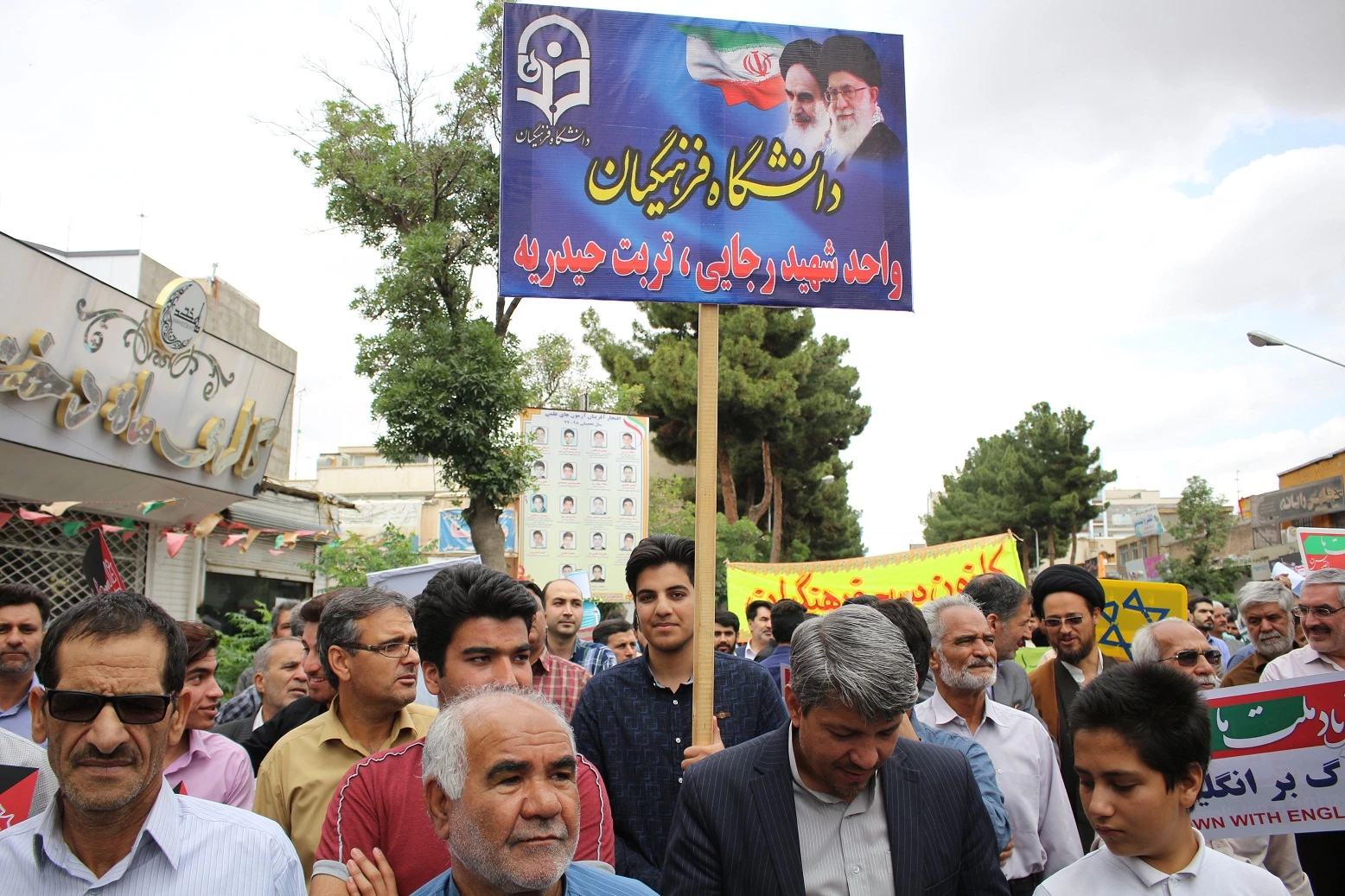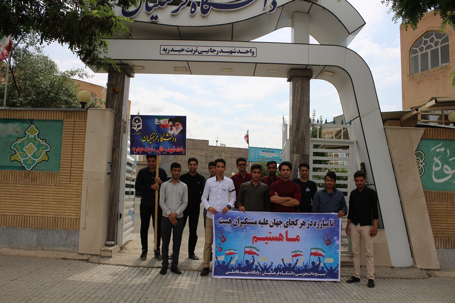 به گزارش روابط عمومی دانشگاه فرهنگیان واحد شهید رجایی تربت حیدریه، دانشجویان،اساتید و کارکنان این واحد دانشگاهی در آخرین جمعه ماه مبارک رمضان 98/03/10  همراه با اقشار مختلف جامعه در تظاهرات روز جهانی قدس  شرکت کردند.