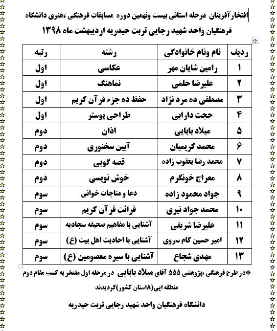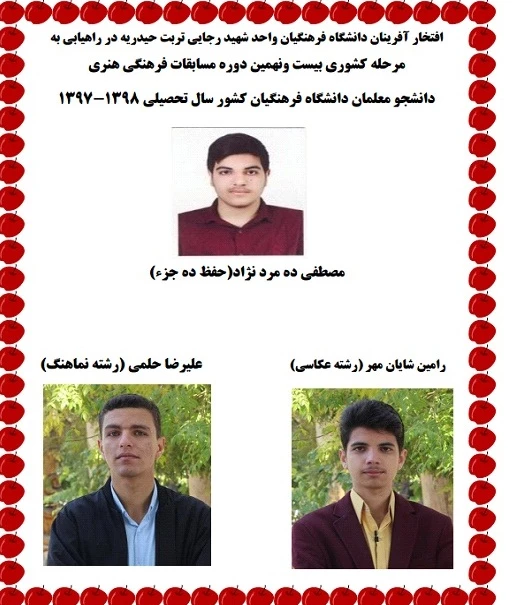 به گزارش روابط عمومی دانشگاه فرهنگیان واحد شهید رجایی تربت حیدریه،دانشجو معلمان این واحد دانشگاهی در بیست و نهمین دوره مسابقات فرهنگی،هنری دانشجو معلمان موفق به کسب بیش از 14 رتبه اول ،دوم و سوم در مرحله استانی شدند و دانشجو معلمان عزیز آقایان رامین شایان مهر در رشته عکاسی ،مصطفی ده مرد نژاد در رشته حفظ ده جزء قرآن کریم و علیرضا حلمی در رشته نماهنگ موفق به راهیابی به مرحله کشوری این دوره از مسابقات شدند.