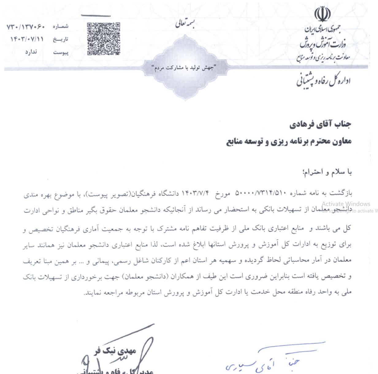 نظر به نامه ارسالی از اداره کل رفاه و پشتیبانی دانشجو معلمان گرامی برای برخورداری از تسهیلات بانک ملی میتوانند به واحد رفاه منطقه محل خدمت یا ادارات کل آموزش و پرورش استان مربوطه مراجعه نمایند.