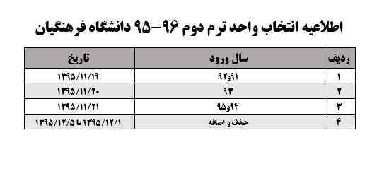 - تاریخ انتخاب واحددانشجویان93 روز چهارشنبه 20/11/1395 و ورودی 95 روز پنجشنبه 21/11/1395 وحذف واضافه 1/12/1395 لغایت 05/12/1395 می باشد.
