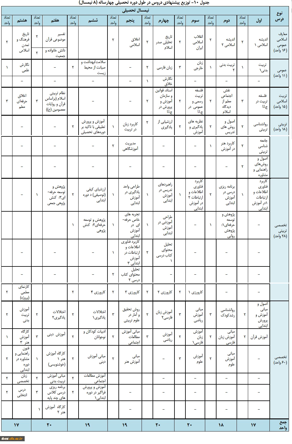 جدول پیشنهادی دروس