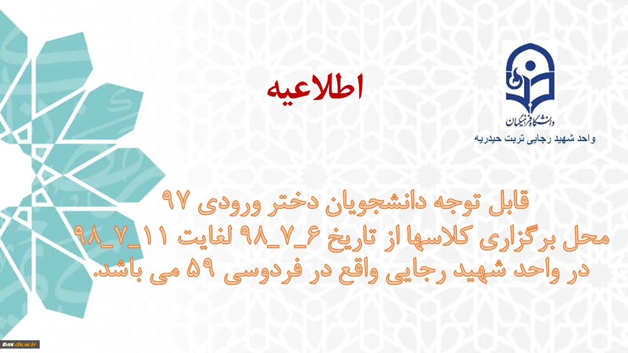 اطلاعیه قابل توجه دانشجویان دختر ورودی 97 محل برگزاری کلاسها از تاریخ 6_7_98 لغایت 11_7_98 در واحد شهید رجایی واقع در فردوسی 59 می باشد. 2