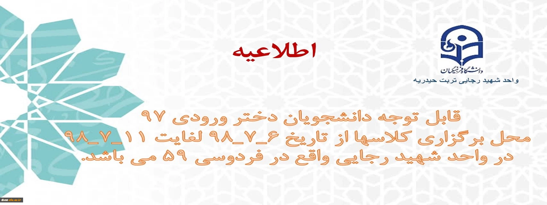اطلاعیه قابل توجه دانشجویان دختر ورودی 97 محل برگزاری کلاسها از تاریخ 6_7_98 لغایت 11_7_98 در واحد شهید رجایی واقع در فردوسی 59 می باشد. 2