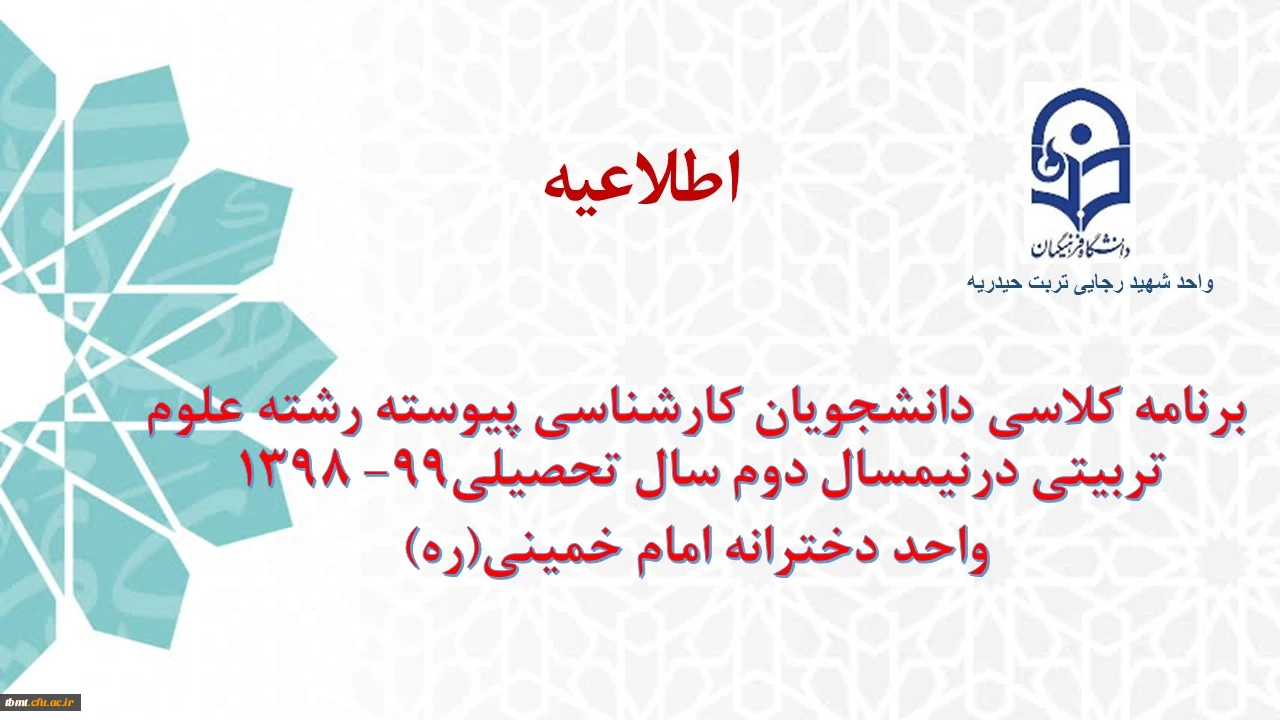 برنامه کلاسی دانشجویان کارشناسی پیوسته رشته علوم تربیتی درنیمسال دوم سال تحصیلی99-1398واحد دخترانه امام خمینی(ره) 2
