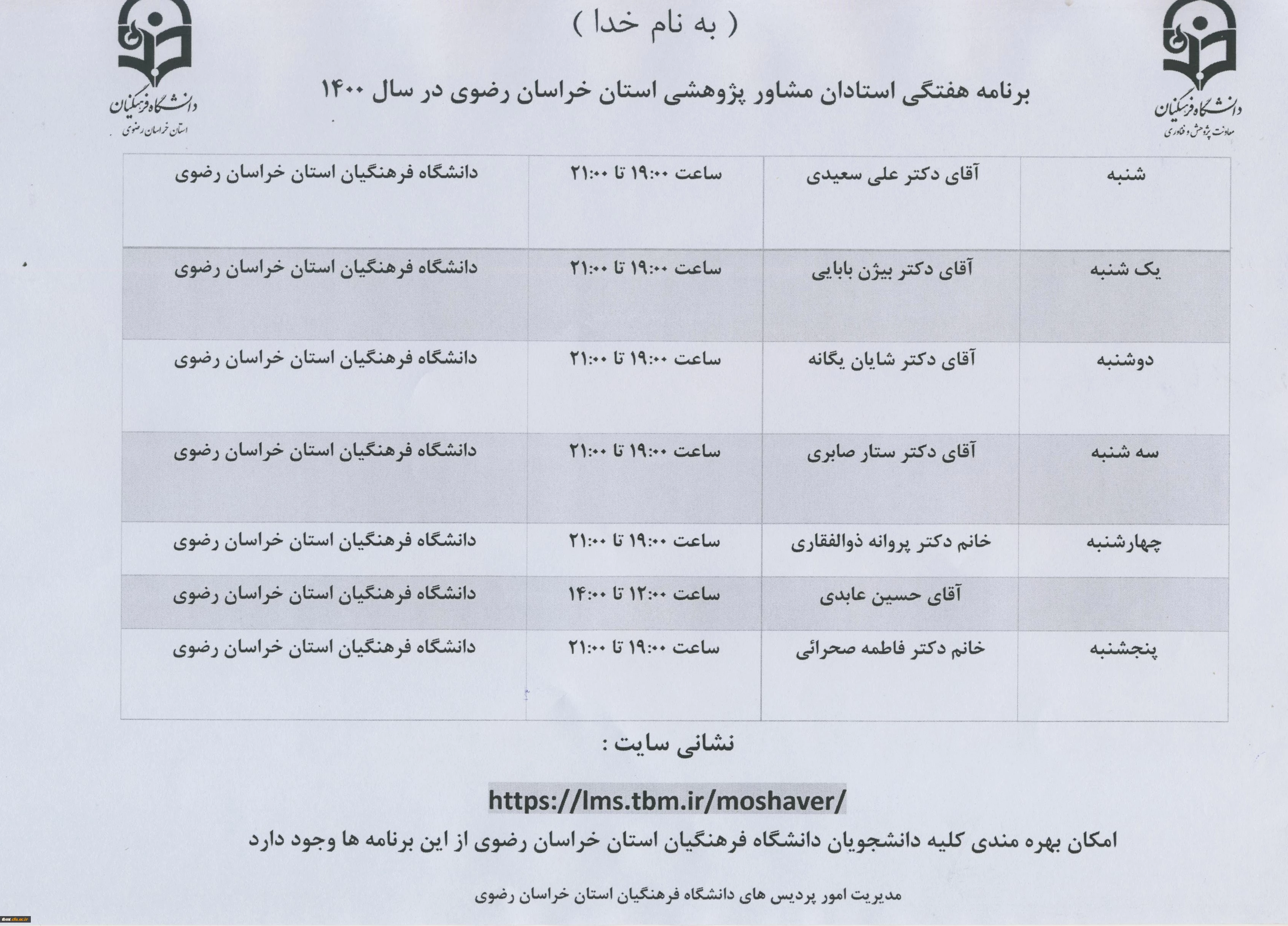 امتیاز دهید : برنامه هفتگی استادان مشاور پژوهشی استان خراسان رضوی در سال 1400 2 یکشنبه 9 آبان 1400 ساعت 14:26
