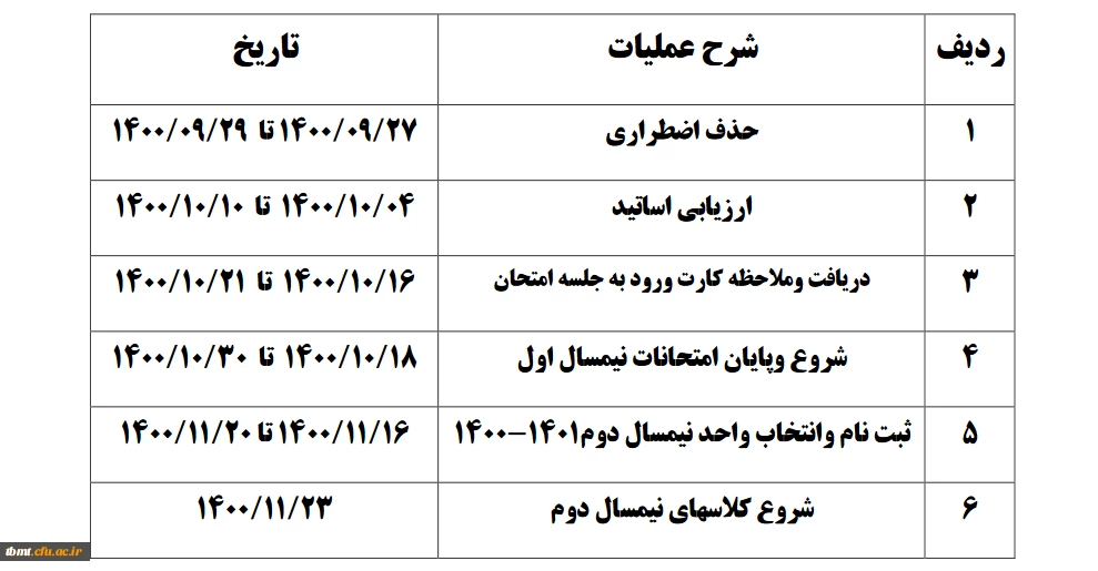 امتیاز دهید : جدول زمانبندی پایان نیمسال اول و شروع نیمسال دوم سال تحصیلی 1401-1400 3 یکشنبه 28 آذر 1400 ساعت 9:46