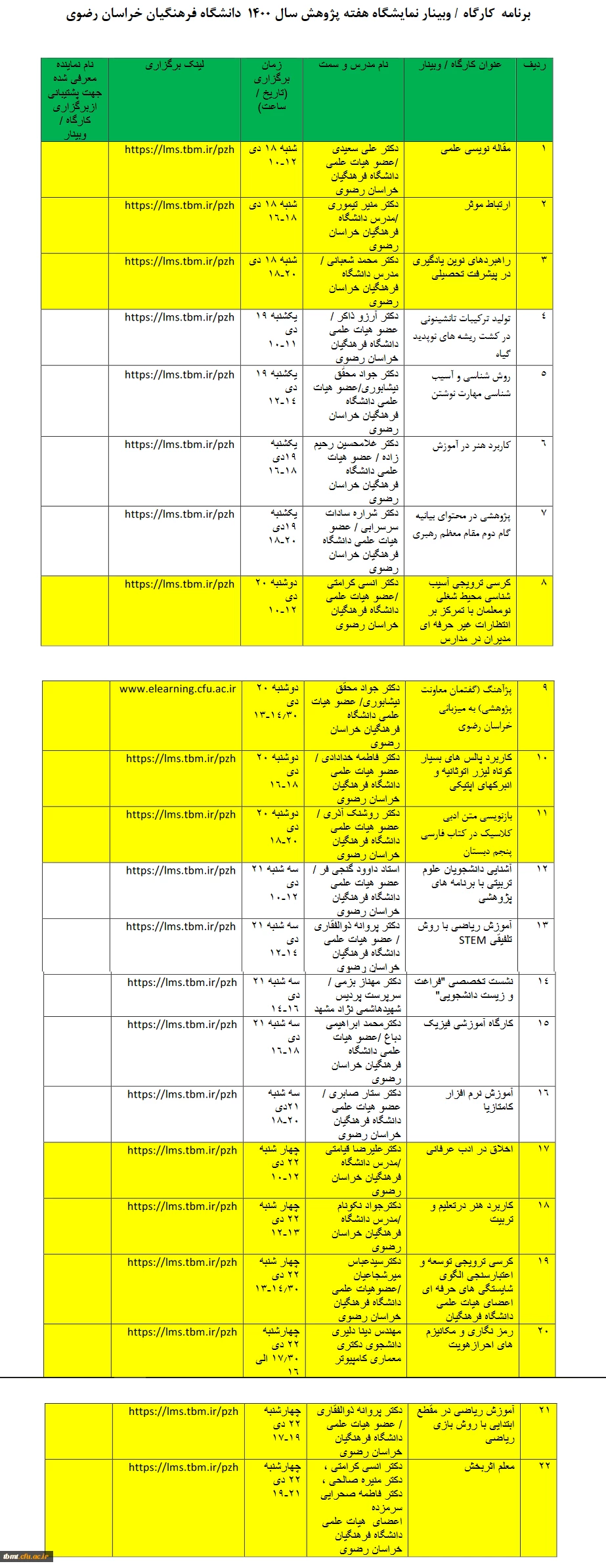 برنامه کارگاه، وبینار نمایشگاه هفته پژوهش سال 1400دانشگاه فرهنگیان خراسان رضوی 2