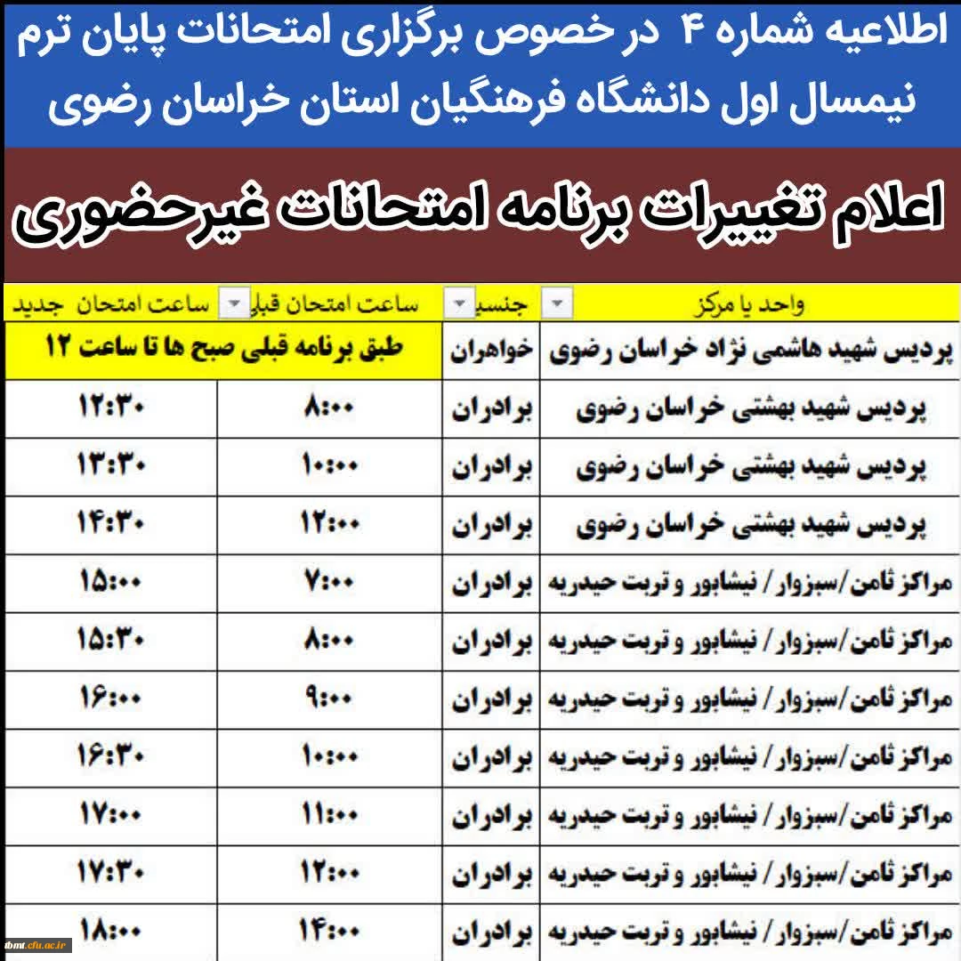 تغییر ساعت امتحانات استان خراسان رضوی 2